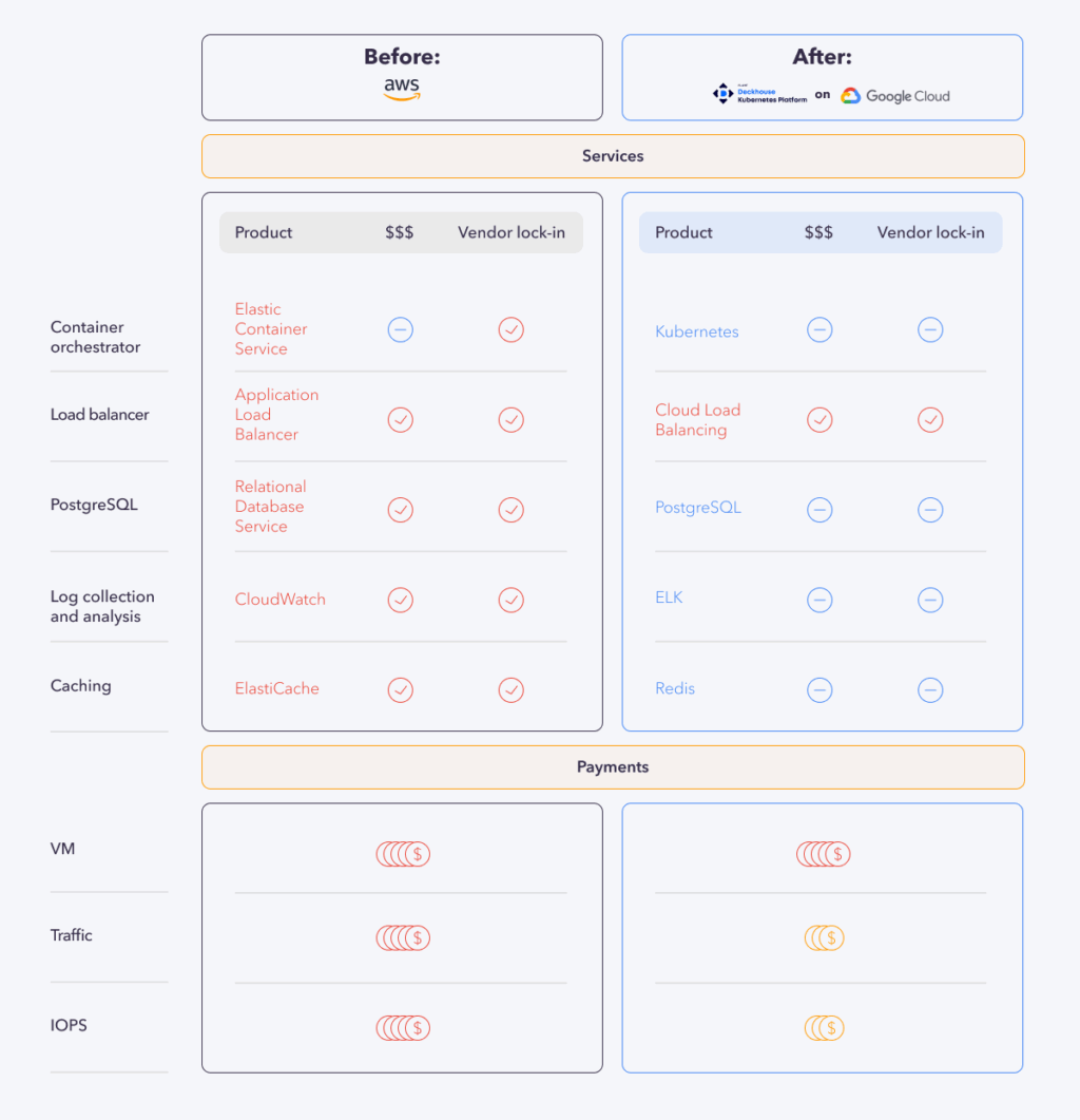 To eliminate these problems, we migrated the infrastructure to self-hosted (not managed) Kubernetes and replaced the cloud services with their Open Source counterparts. At the same time, we switched to the Google Cloud Platform. However, it’s important to note that it was not the new provider but the move to K8s and other self-hosted solutions made the savings possible (more details provided below).