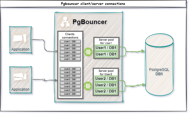 PgBouncer handles connections between clients and the database server using a connection pool. The client connects to PgBouncer as if it were a regular PostgreSQL database, and then all its requests are routed through the pool of server-side connections that PgBouncer establishes and manages on its own.