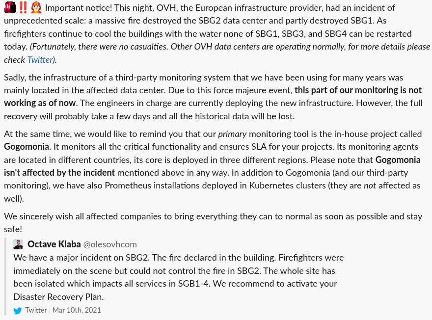 This article shares our experience in addressing the impact the OVH data centers fire had on our monitoring infrastructure and lessons learned.