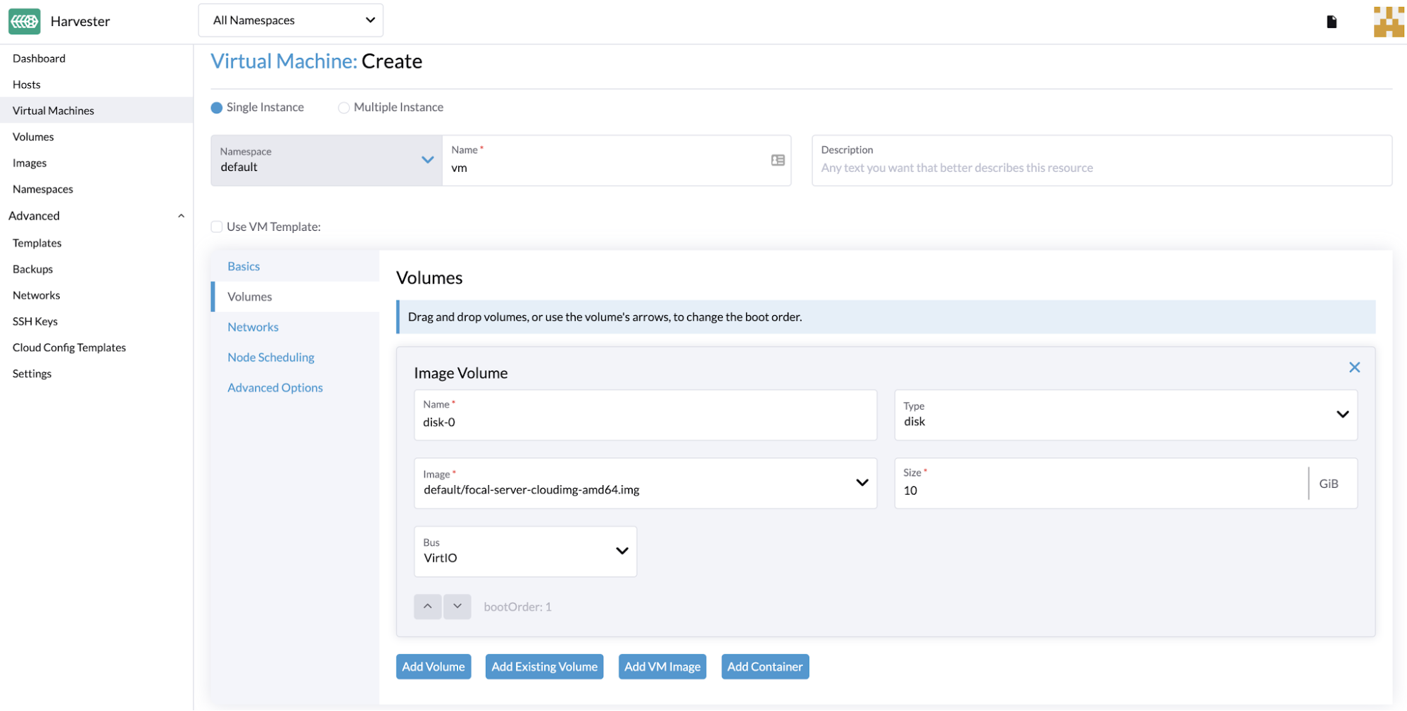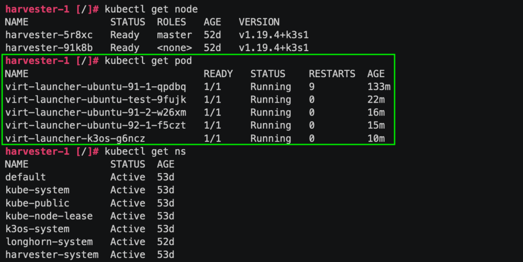 Harvester can be administered both through the web interface (GUI) and CLI (using kubectl). In the case of kubectl, virtual machines are treated in the same way as Kubernetes Pods: