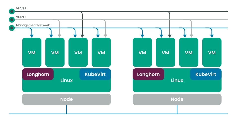 Storage: Longhorn, another incubating CNCF project, serves as a storage area network (SAN). It is a cloud-native, highly available distributed block storage for Kubernetes. MinIO is used to store VM images.