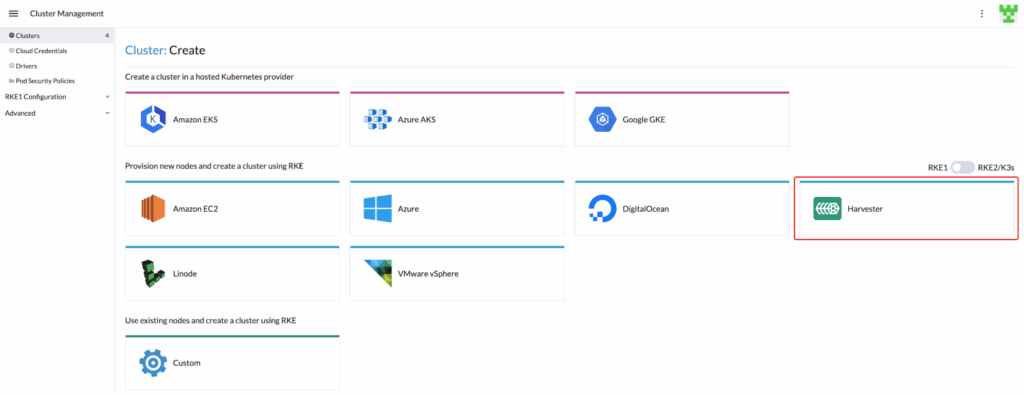 Harvester can also be integrated with the K8s Rancher platform (v2.6.1 and up) to handle the complex multi-cluster infrastructure. In this case, the Harvester cluster can be administered through the Rancher dashboard and acts as an additional cloud provider.