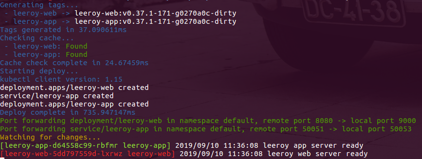 At the same time, the Skaffold’s output to the console has not changed except for one thing: it has deployed leeroy-app