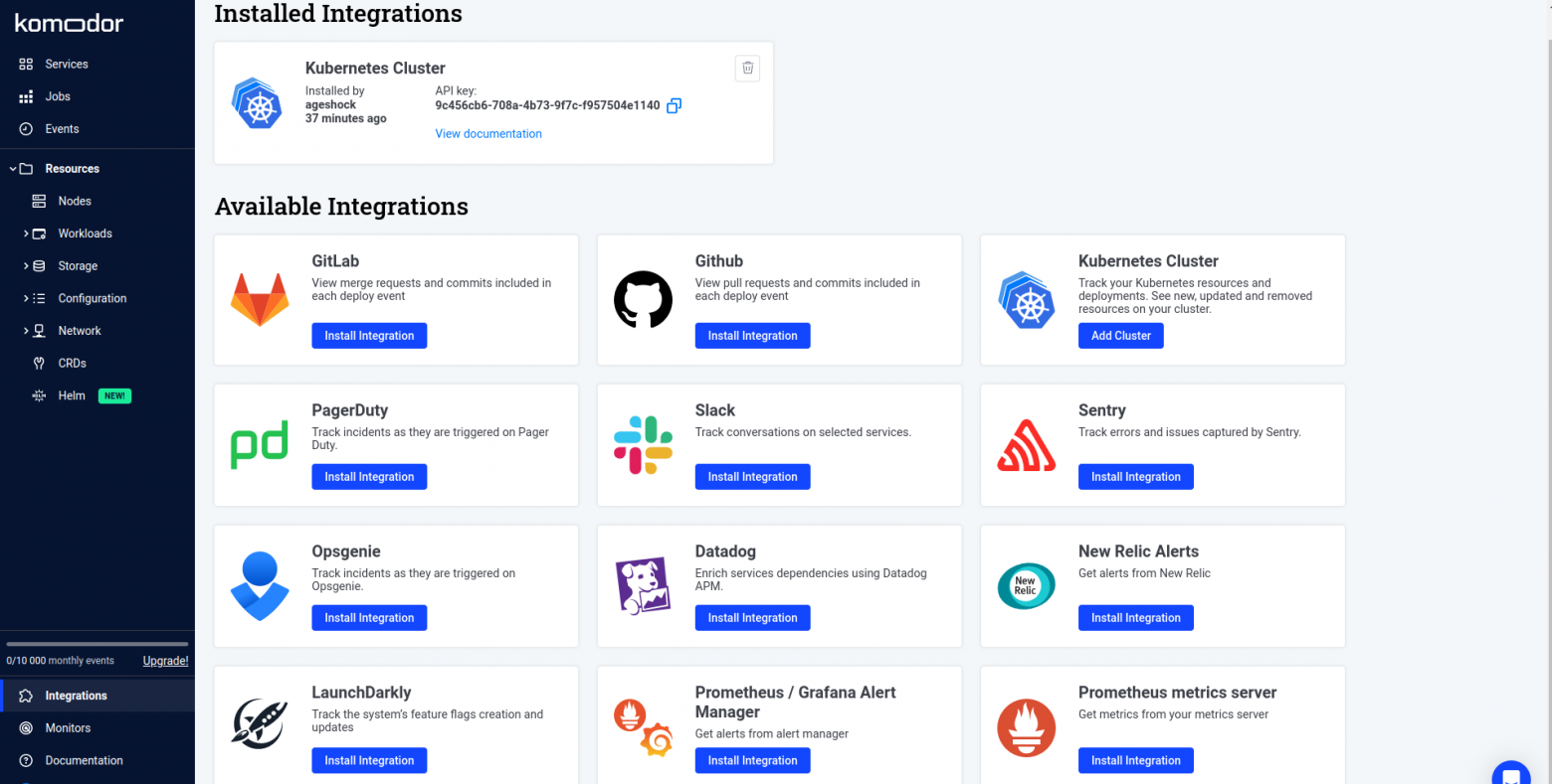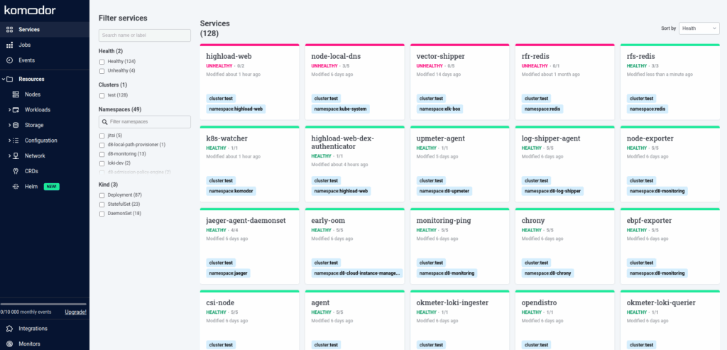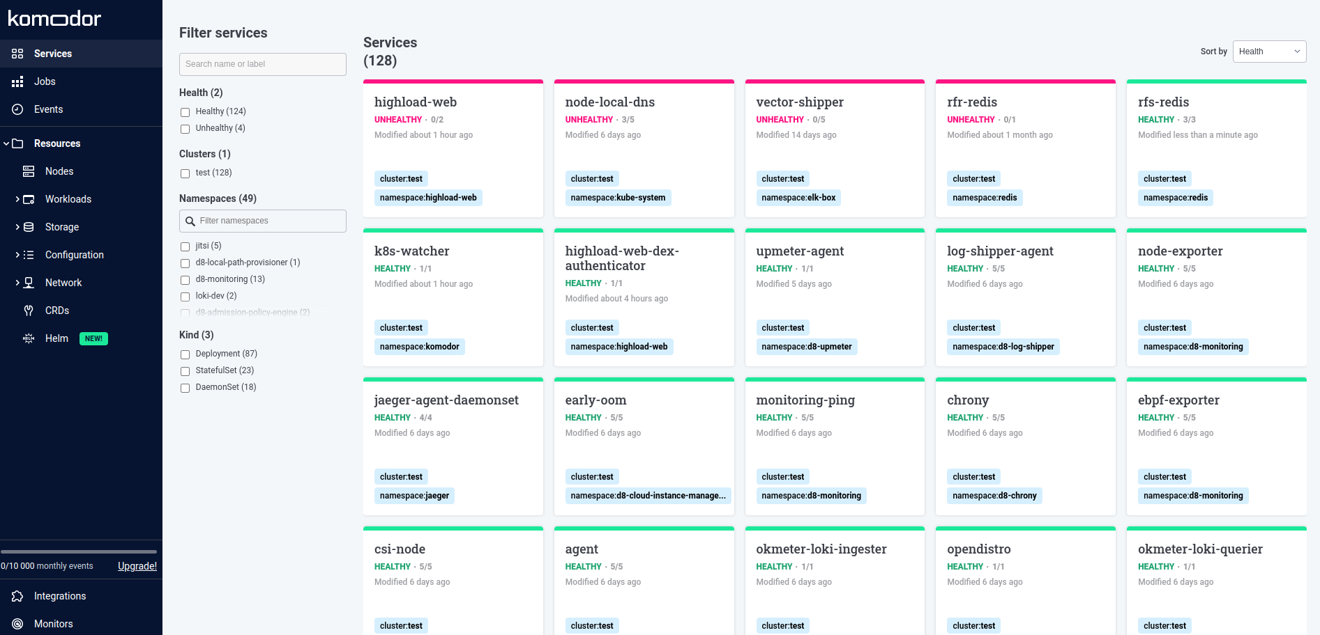 Once the agent is deployed in the cluster, a web interface with a dashboard becomes available in your personal account on the Komodor website.