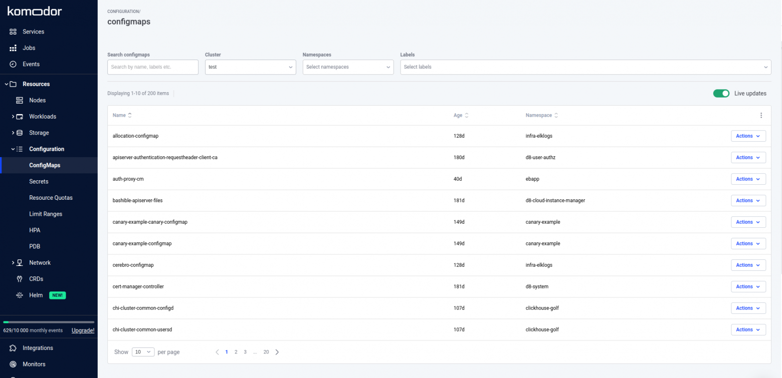 - Configuration: ConfigMaps, Secrets, Resource Quotas, Limit Ranges, HPA, and PDB. You can view the details of ConfigMaps and Secrets as well as edit and delete them. Meanwhile, for other resources, you can only view the details. Secrets are displayed Base64-encrypted.