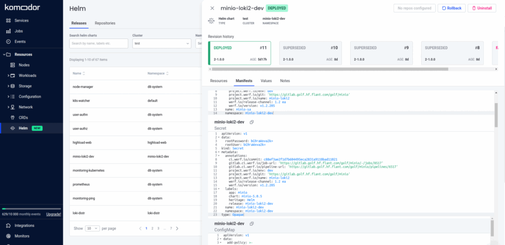- Helm: Helm releases. You can browse release resources, switch to a resource by clicking on it, and view the manifests and as well as the values used for the release, comparing them with a particular version in addition to rolling back to a specific version and removing the release from the cluster.