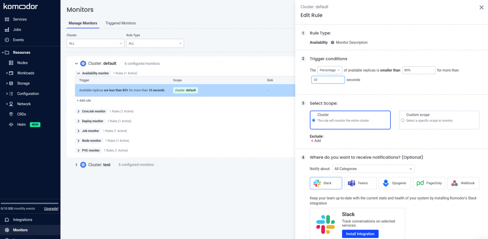 - No-hassle monitor configuration. The monitors track the status of cluster resources and send notifications to services like Slack, Teams, Opsgenie, PageDuty, or any other service that supports receiving webhooks.