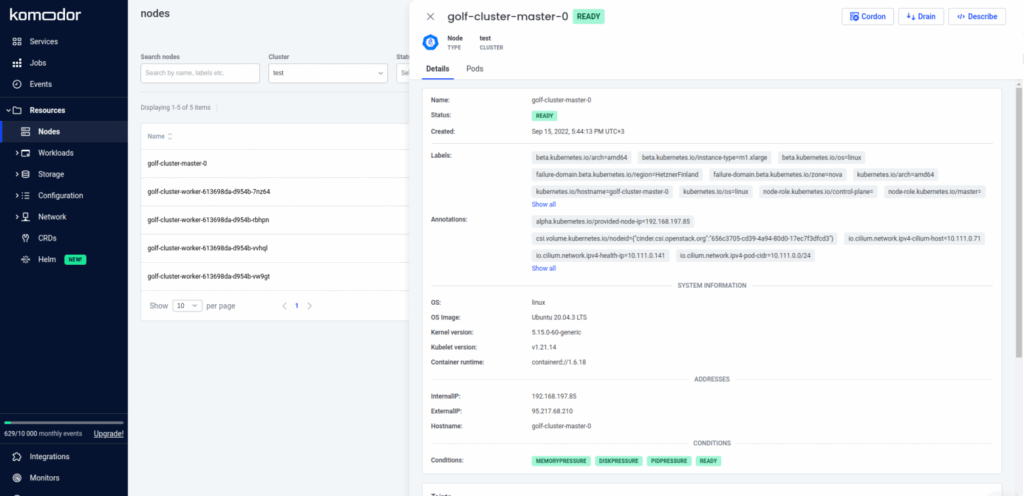 - Nodes: the user can drain or cordon the selected node, get it to rejoin the cluster, as well as browse its details and a list of all pods on the node.