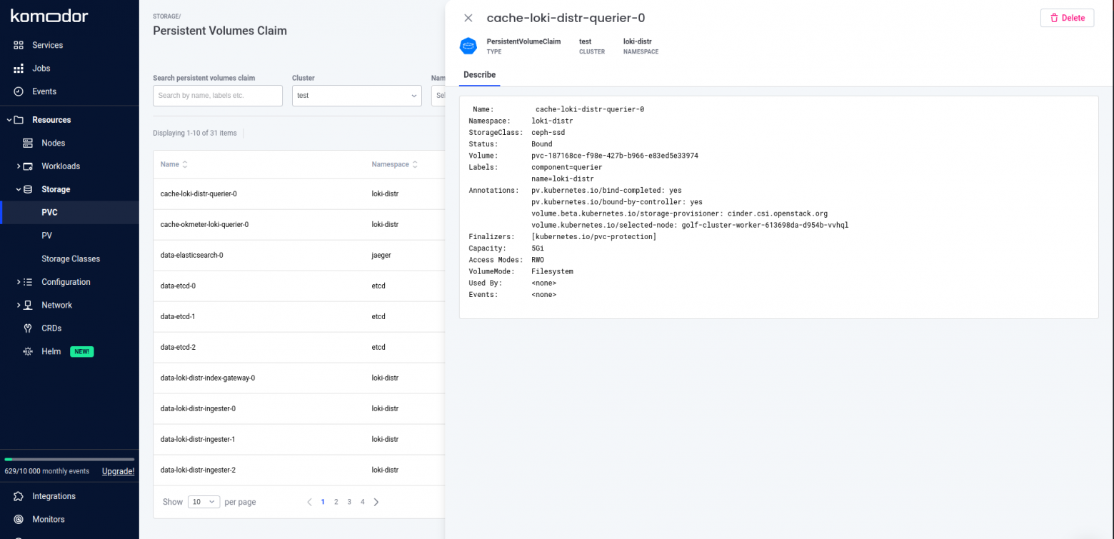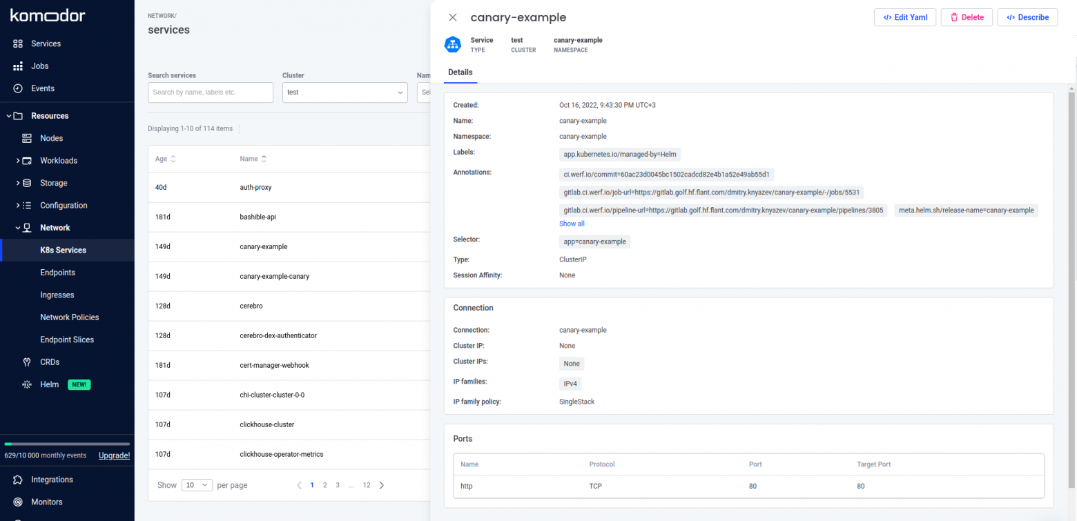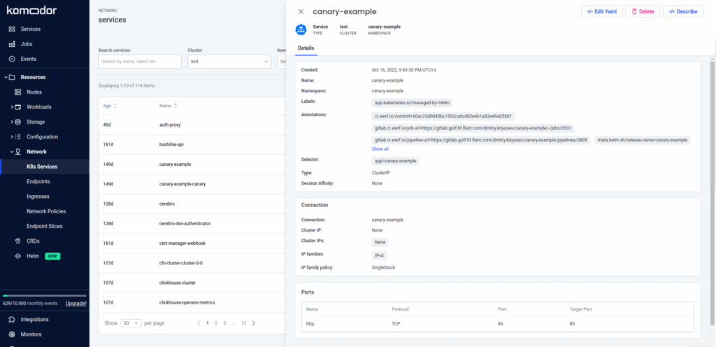 Services: access all your K8s services instantly. You can filter them according to various criteria or click to view additional details about the service. It is equipped with the ability to edit, manage the status, as well as browse related events.