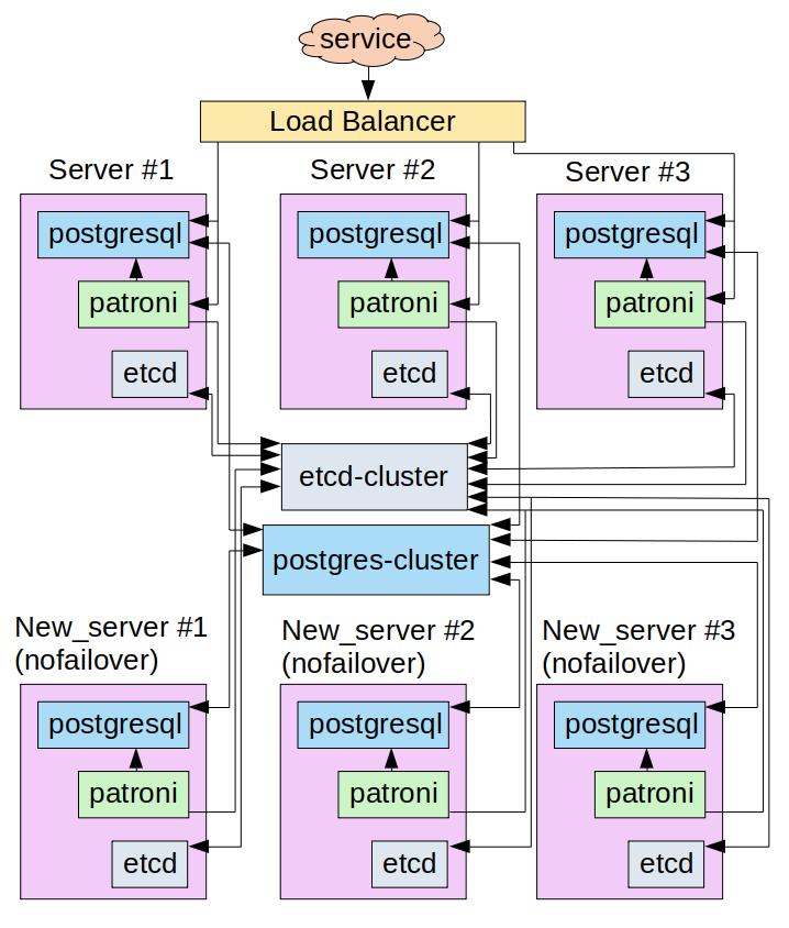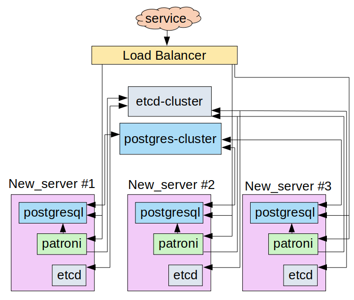- An etcd cluster (to store the Patroni state) consisting of three instances running on each of the Patroni cluster servers;