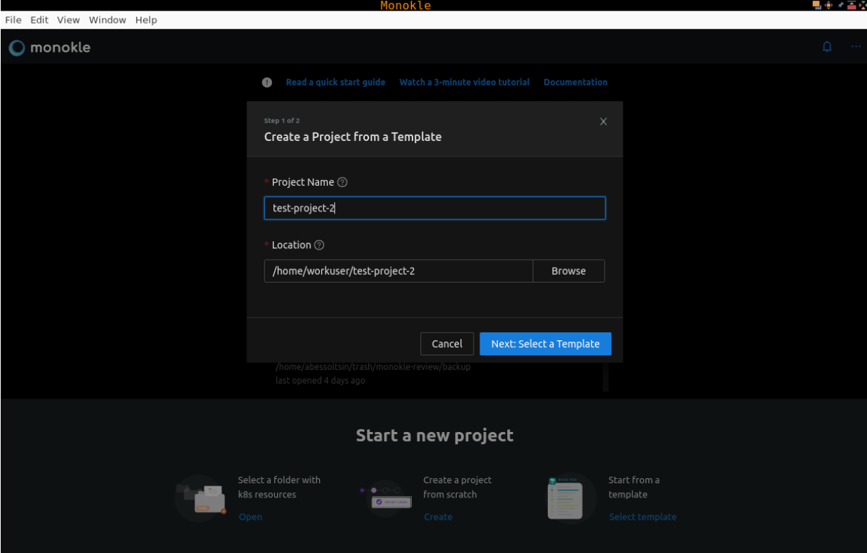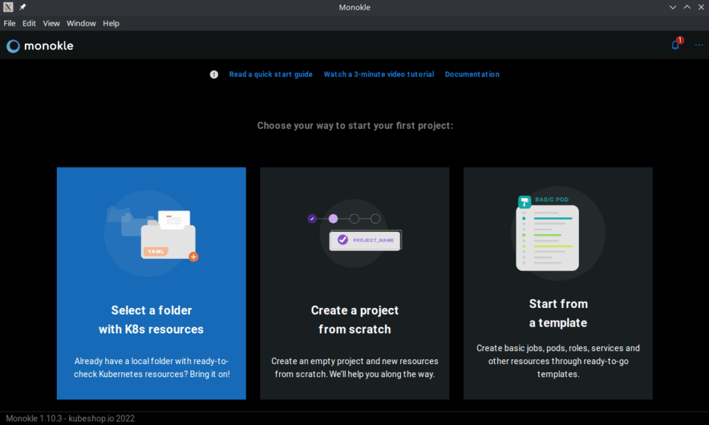 First, I downloaded the appropriate distribution. Once the installation was complete, Monokle offered me three choices: open the current chart directory, create the manifest from scratch, or use the template to create a set of resources.