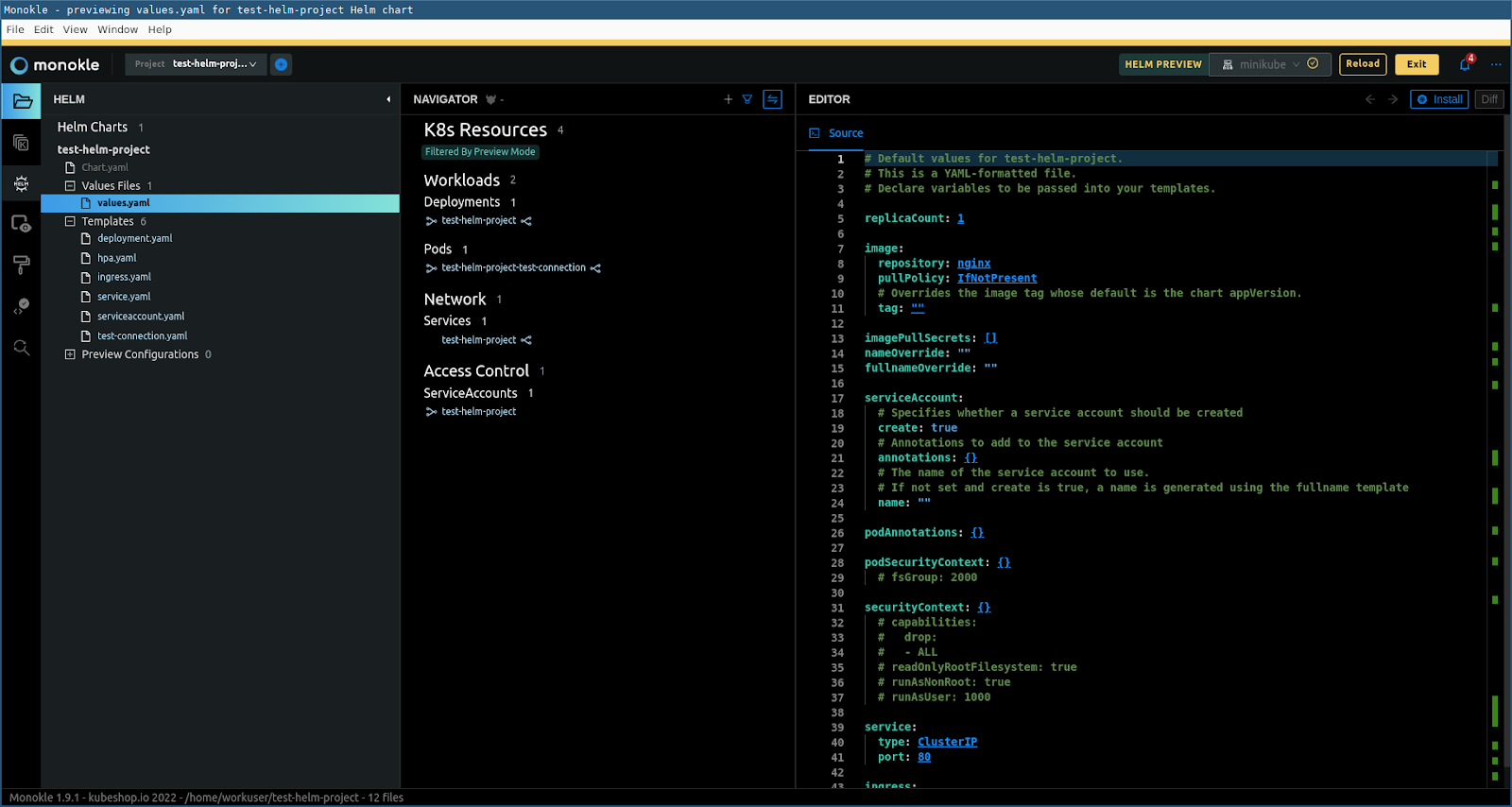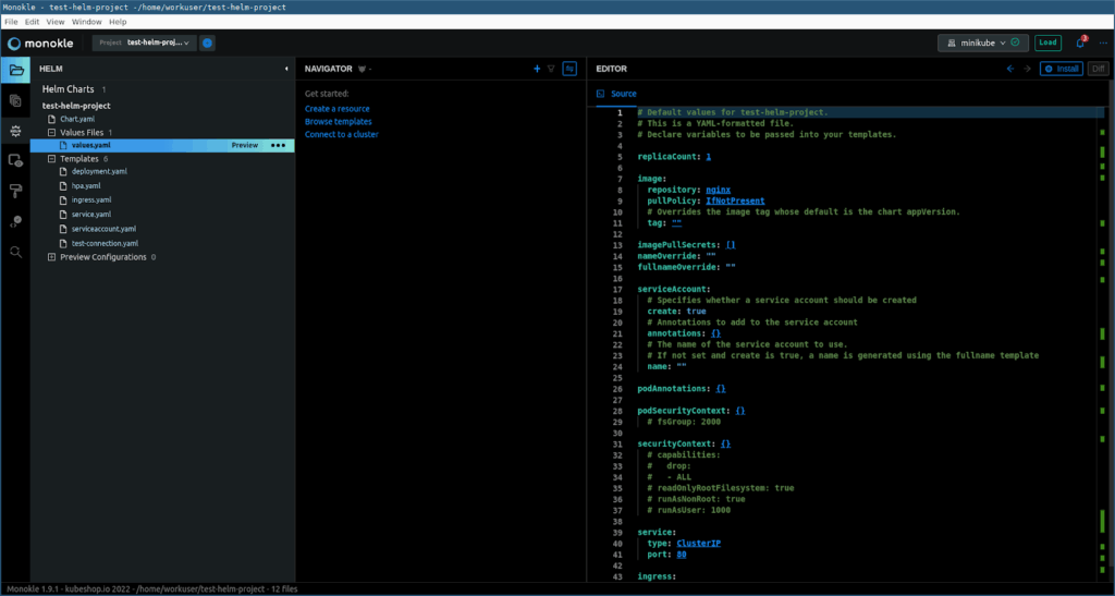 Since Helm is more common for me, I decided to opt Helm for my test project in Monokle. Its template was created using the helm create mytestproject
