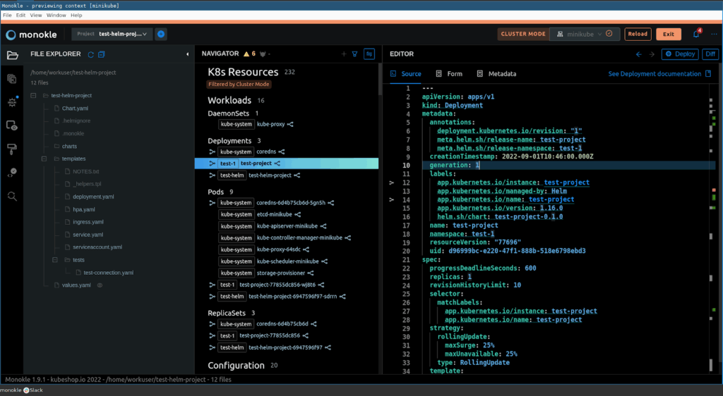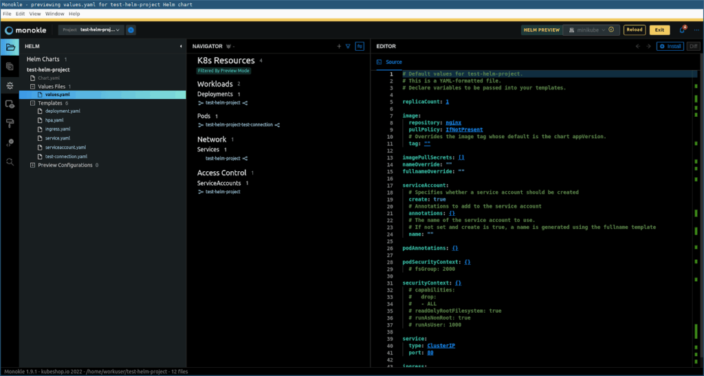 My Monokle’s current state switched to Helm Preview. In this mode, in the middle Navigator section, you can preview the resources to be created in the cluster. As the name suggests, this mode does not allow anything to be edited. However, you can deploy the generated resources to the Kubernetes cluster to see if there are any inconsistencies.