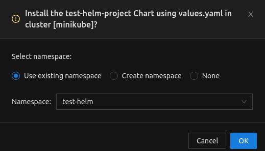 Next, I decided to deploy something to the Minikube cluster running on my computer. Now it was the Install button’s turn: select the values.yaml