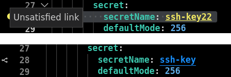- Syntax highlighting: for example, Monokle will display a message that there is no such Secret if you misspell the Secret’s name (thus indicating an error in the name). The same is true for other cross-linked resources: