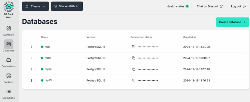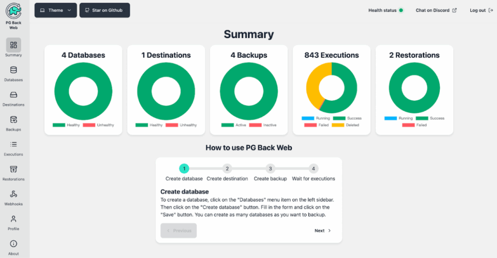 PG Back Web also includes a set of tools to monitor database availability and whether or not the backup was successful. The source is written in Go and available under the AGPL 3.0 license.