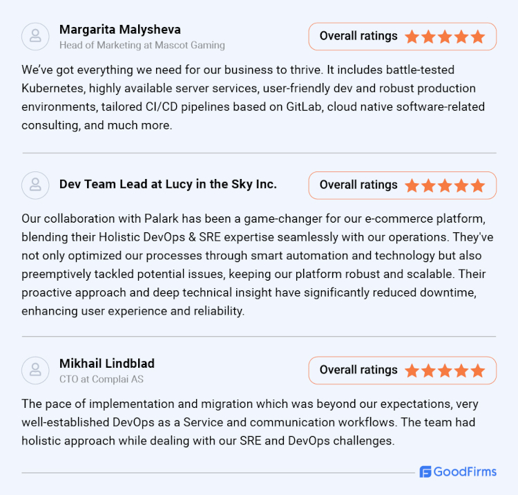 Palark had to undergo a rigorous assessment under the GoodFirms Leaders Matrix program. The evaluation covered the service landscape, verified client reviews, experience in the domain, market, competitive positioning, and much more. Such analysis helped surface in-depth strategic information about Palark’s capabilities, competitive differentiation, and market position. This assessment is confirmed by numerous customers choosing us as a reliable SRE & DevOps partner.